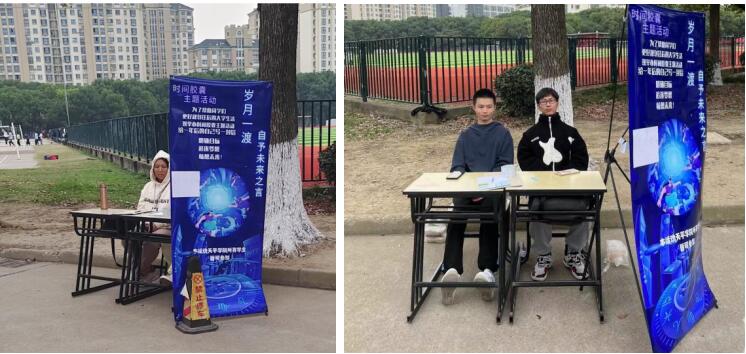本次活动自11月14日开始宣传,宣传采用摆摊的形式,通过摆摊,得到了积极反响,一大批同学在信签纸上留言并积极了解活动。,大家以目前大学生活为基础,以一年为时间轴,给未来的自己写一封信,自信自强、守正创新、踔厉奋发、勇毅前行,为全面建设社会主义现代化国家、全面推进中华民族伟大复兴而团结奋斗!