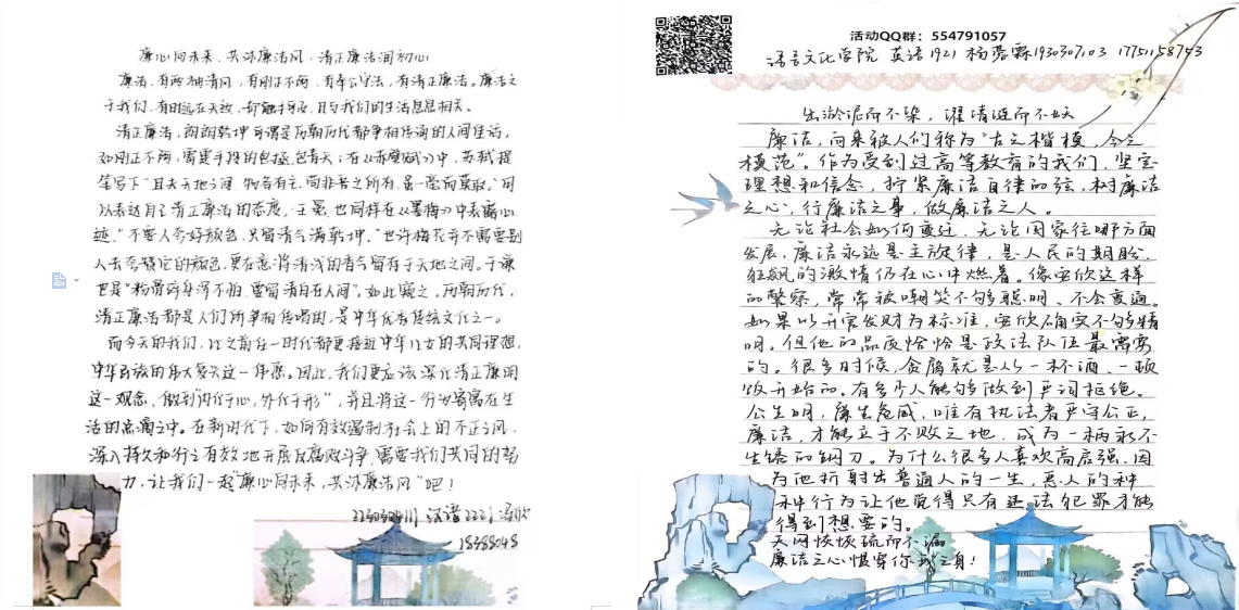 为进一步营造廉洁文化宣传教育的浓厚氛围,弘扬崇廉尚洁的价值观念,推动学校党风廉政文化建设。结合学校工作实际,组织开展多样化廉洁文化宣传活动,使廉洁文化人人来参与,个个受教育,事事守规矩,营造“以廉为荣,以贪为耻”的校园廉洁文化氛围。2023年4月3日,语言文化学院团总支组织了“廉心向未来 共沐廉洁风”的主题活动。