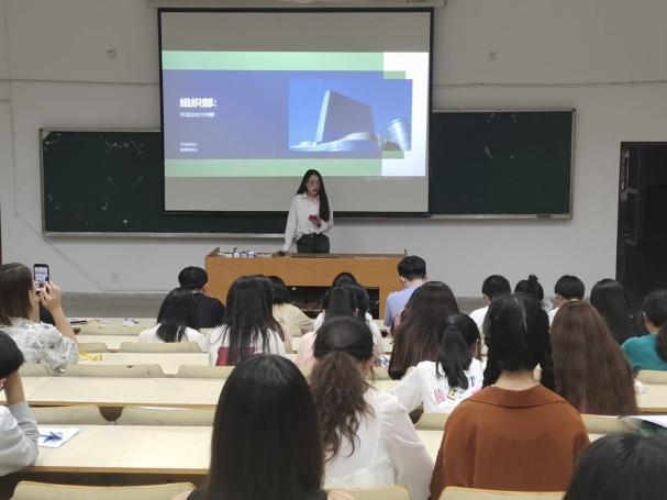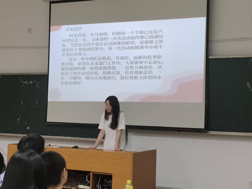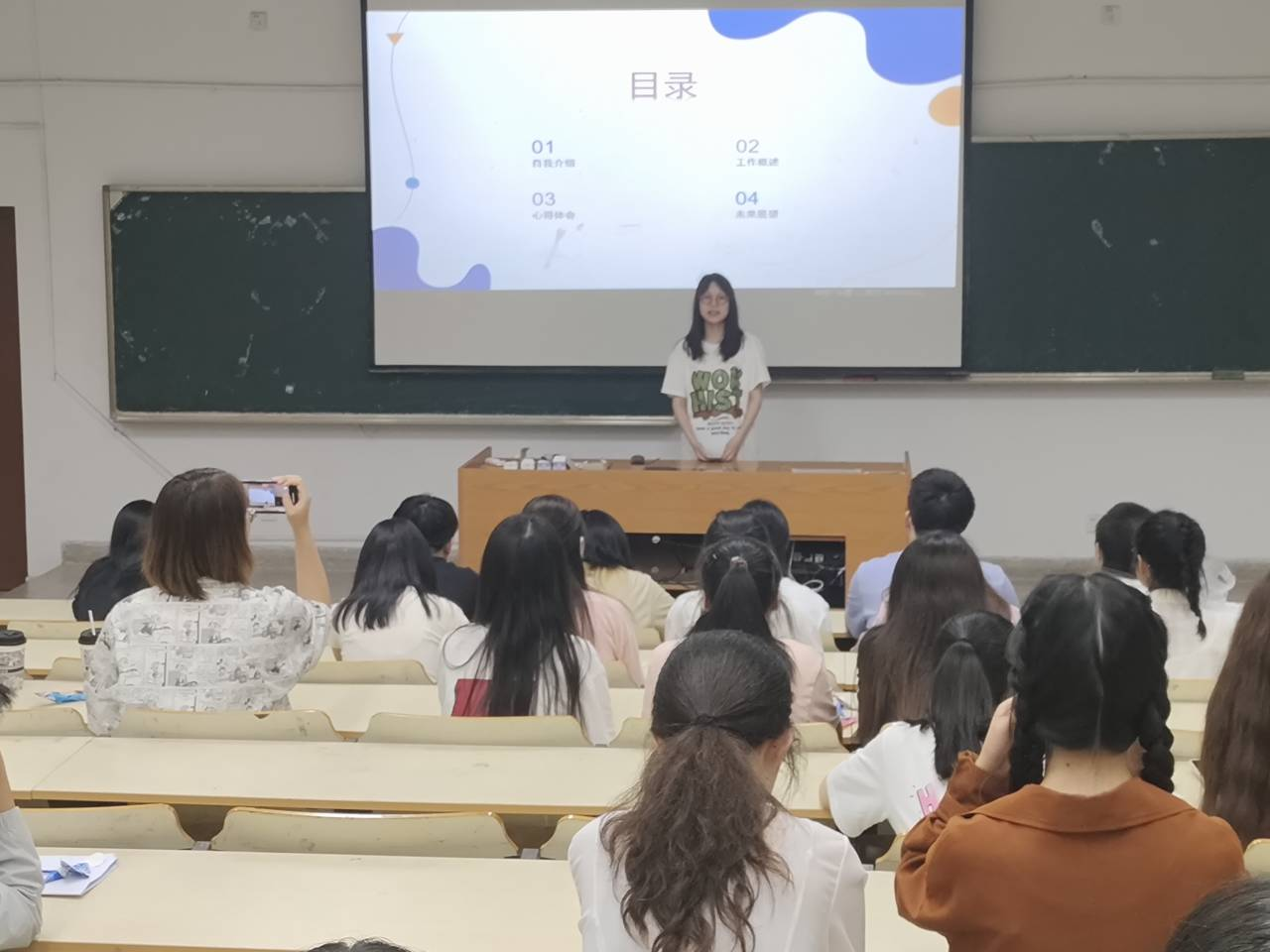 宣传部围绕学校各大活动的海报制作以及公众号及官方qq新闻稿撰写等工作内容进行述职,总结团队合作精神等重要性。