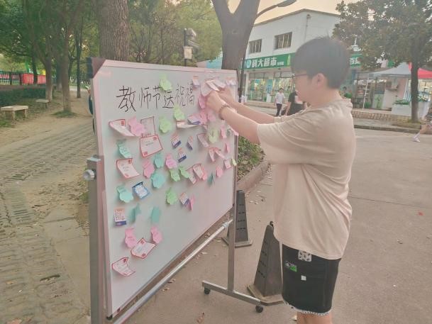 在教师节到来之前,环境科学与工程学院团学组织文体部便制定了教师节送祝福的策划案,并在一周内进行了摆摊宣传,每天上午10点30—12点30及下午4点30—6点30有3名同学按时值班,期间很多同学在横幅上签下自己的姓名并在贴纸上写下了对老师的祝福贴在白板上。同时我校举办了“我爱我师”线下投票活动选出了最受学生喜爱的任课老师及辅导员。由于教师节在周日,同学们便在上周五每次课前,集体起立向老师致以最真诚的祝福与感谢,并且写下贺卡赠与老师。