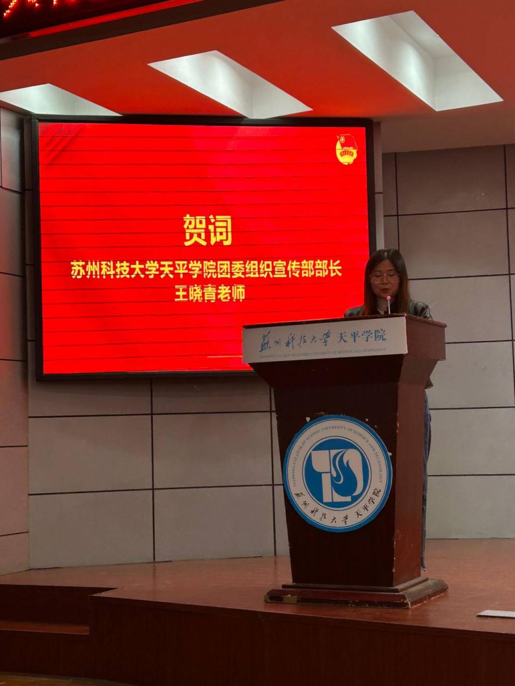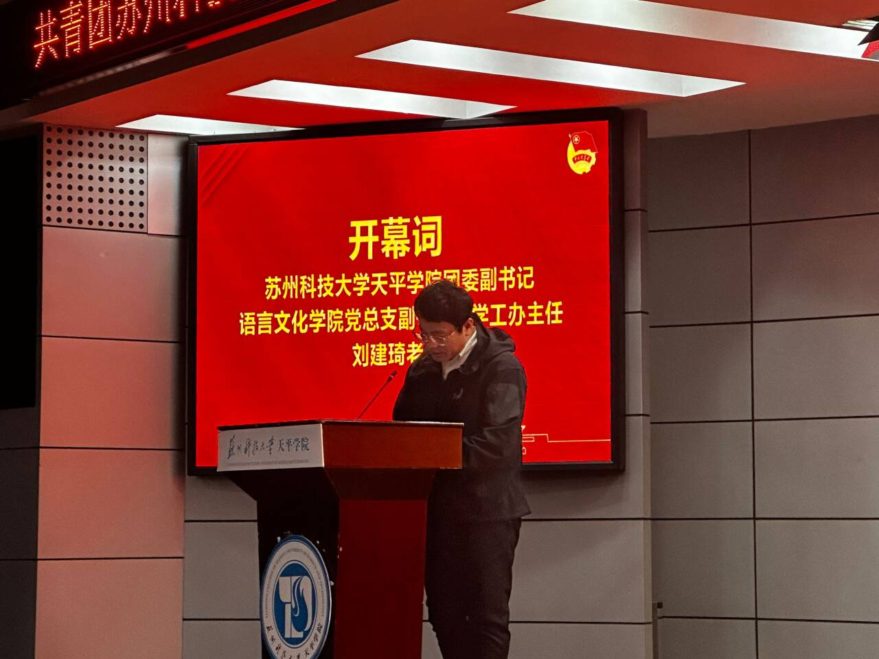 大会伊始,由语言文化学院党总支副书记、学工办主任刘建琦老师致开幕词,并对全体同学表以衷心祝愿。随着主持人:“全体起立奏唱中华人民共和国国歌”,会场响起了庄重肃穆的歌声。随后,会议正式开始并为上一届语言文化学院团总支、学生会各部门部长颁发聘书。