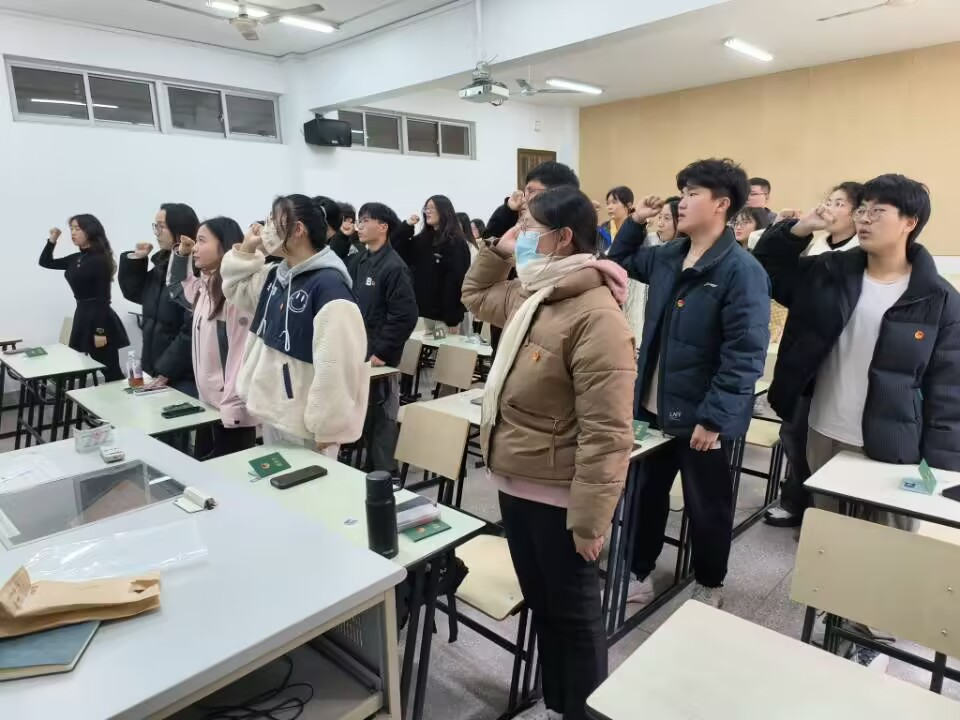 峥嵘百年路,奋发新时代。为深入学习贯彻习近平新时代中国特色社会主义思想和党的二十大精神,团结引领广大团员永远跟党走,加强对青少年的思想引领,切实增强广大团员的光荣感和使命感,增强团组织的凝聚力,365速发国际在线登录入口于2023年12月13日在2-208教室举行了2023年下半年新团员入团宣誓仪式。本次仪式语言文化学院团总支书记陈箫箫老师主持,团总支部长和新老团员参加本次会议。