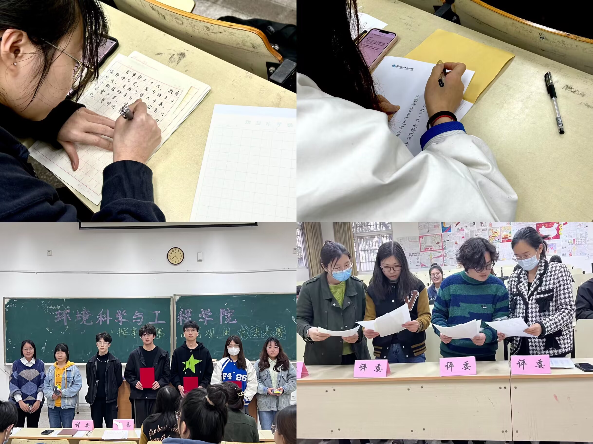 此次比赛类型分为硬笔、软笔,参赛选手选其一进行比赛,需在半小时内完成作品。活动现场,参赛选手认真品味着汉字的艺术魅力,凝神运笔,挥毫展墨,直画如剑,曲笔似藤,纵横捭阖辟新径,酣畅淋漓展技艺,完全沉浸于书法的艺术乐趣之中。不同字体各有各的风采,楷书端庄平稳、苍劲有力;行书优美飘逸、清雅流畅。活动尾声,一幅幅佳作跃然纸上,并由闫立、王浩宁、刘伟、李小凤四位老师评选,获奖名单如下:
