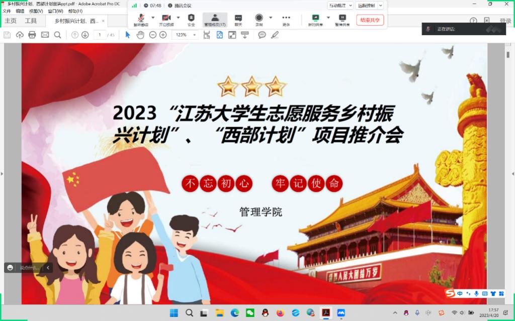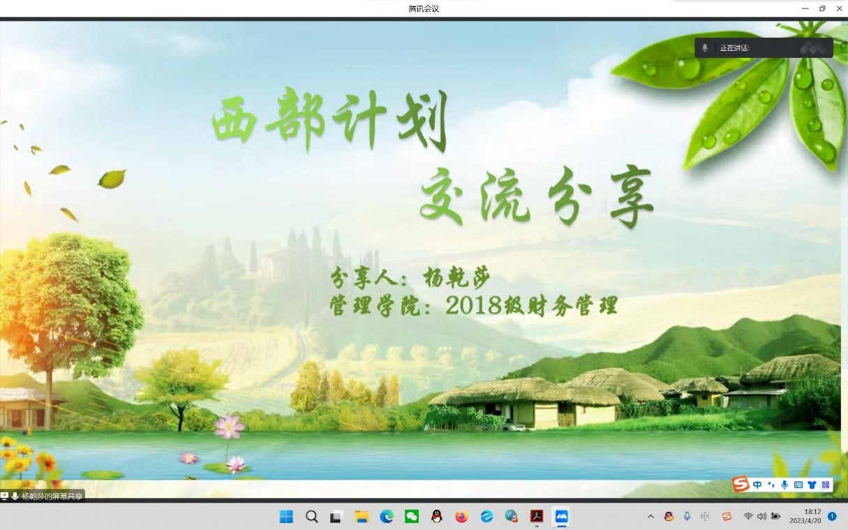 为进一步宣传乡村振兴计划、西部计划,更深层次动员365速发国际在线登录入口青年大学生扎根基层、扎根西部,引导学生躬亲实践,管理学院团总支于4月20日晚召开了2023年“西部计划”、“志愿服务乡村振兴计划”线上宣讲会。